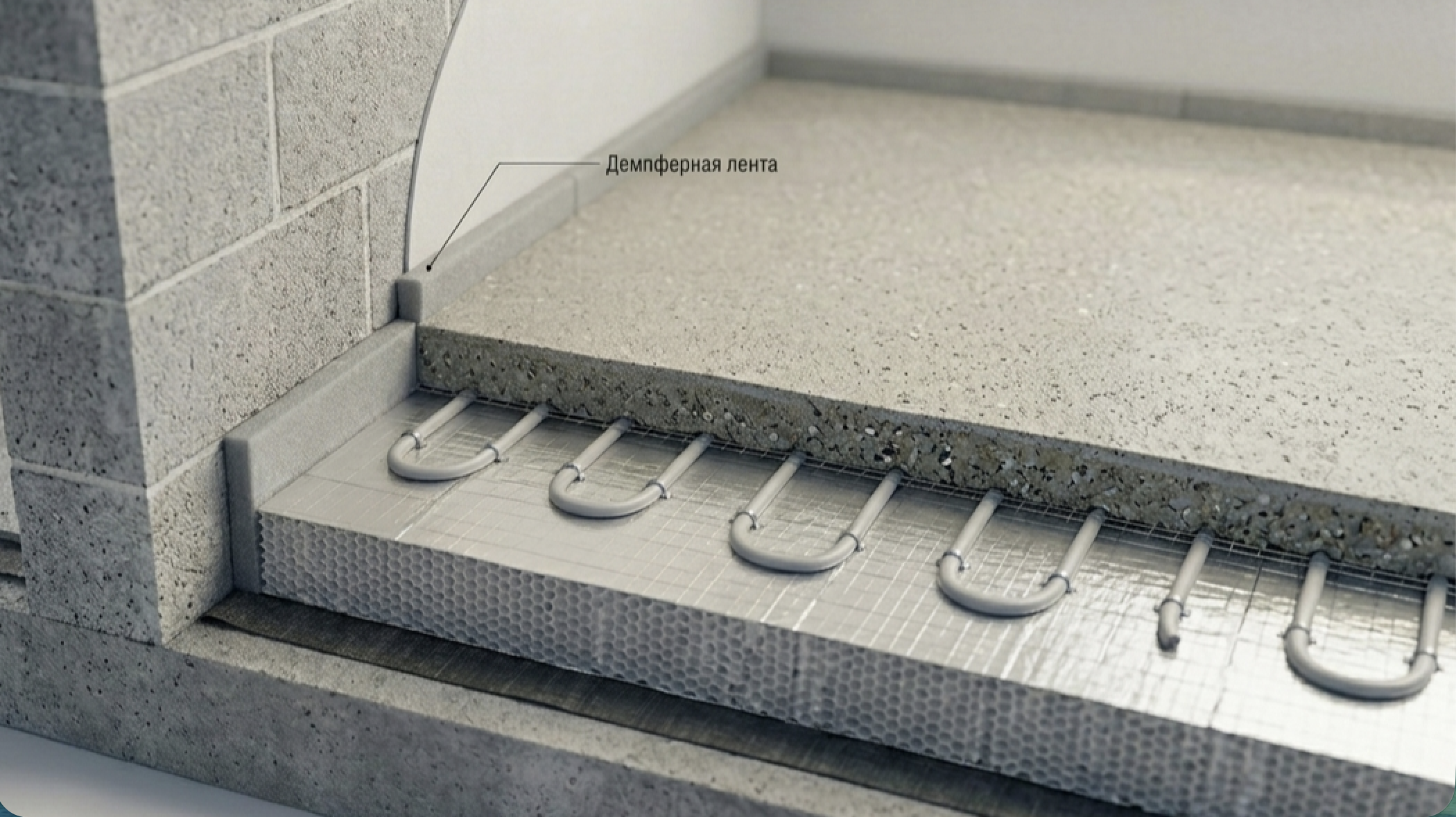 В конструкции пола демпферная лента участвует в работе узла стяжки и обеспечивает корректное взаимодействие жёстких элементов.